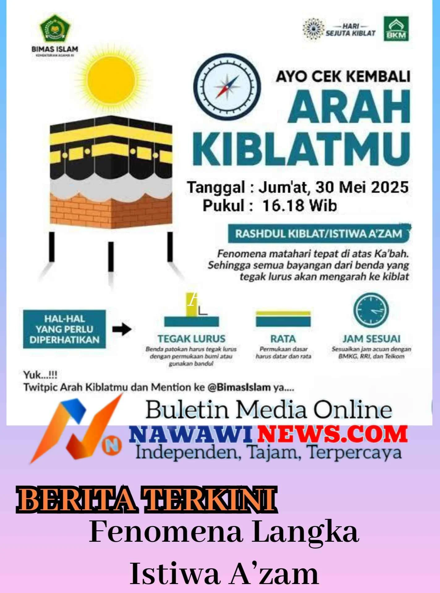 Jakarta — Hari ini, Jumat, 30 Mei 2025, sebuah fenomena astronomi penting yang dikenal sebagai Istiwa A’zam atau Rashdul Qiblat akan terjadi dan bisa dimanfaatkan seluruh umat Muslim, terutama di Indonesia bagian Barat dan Tengah, untuk mengecek keakuratan arah kiblat.