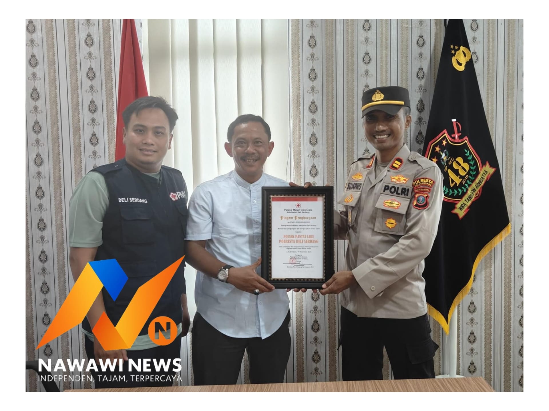 PANTAI LABU || NAWAWINEWS.ID -Polsek Pantai Labu Polresta Deli Serdang menerima Piagam Penghargaan dari Palang Merah Indonesia (PMI) Kabupaten Deli Serdang atas partisipasi dan kerjasamanya dalam pelaksanaan kegiatan bakti sosial donor darah. Penghargaan ini menjadi istimewa karena merupakan kali pertama PMI Deli Serdang melaksanakan kegiatan donor darah di Kecamatan Pantai Labu.