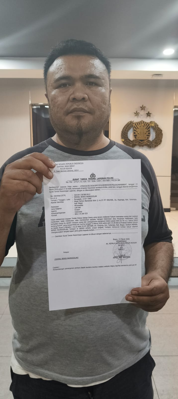 Laporan tersebut kini telah resmi diterima oleh pihak kepolisian dengan nomor registrasi: LP/B/626/III/2026/SPKT/Polres Bogor/Polda Jawa Barat.