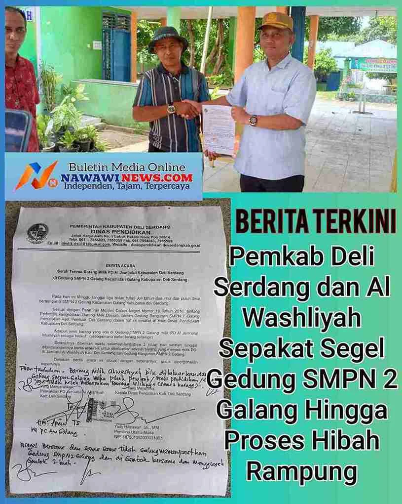 Deli Serdang — Pemerintah Kabupaten (Pemkab) Deli Serdang bersama Pengurus Daerah (PD) Al Jam’iyatul Washliyah Kabupaten Deli Serdang sepakat untuk menyegel Gedung SMP Negeri 2 Galang, Kecamatan Galang, sebagai langkah pengamanan sementara hingga proses hibah barang milik daerah diselesaikan secara tuntas.