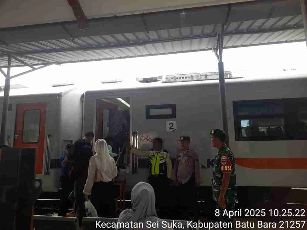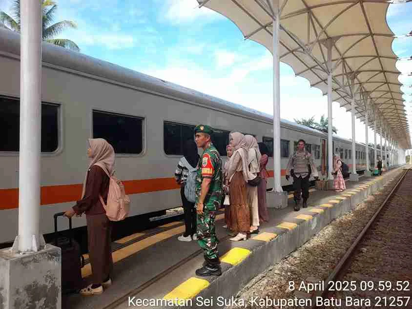 Bandar Masilam, Simalungun — Polsek Perdagangan melaksanakan pengamanan arus balik Lebaran 2025 di Stasiun Kereta Api Bandar Tinggi, Nagori Bandar Tinggi, Kecamatan Bandar Masilam, Kabupaten Simalungun, Selasa (8/4/2025).